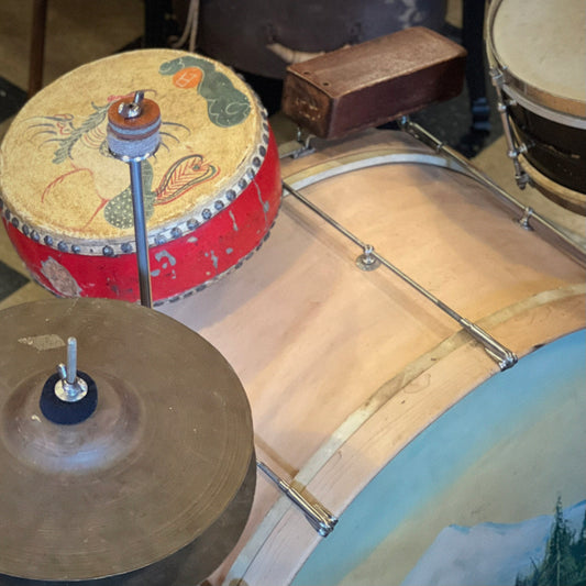 VINTAGE 1936 Slingerland Radio Outfit with Natural Satin Bass Drum & 5x14 Universal Model Black Lacquer Snare Drum