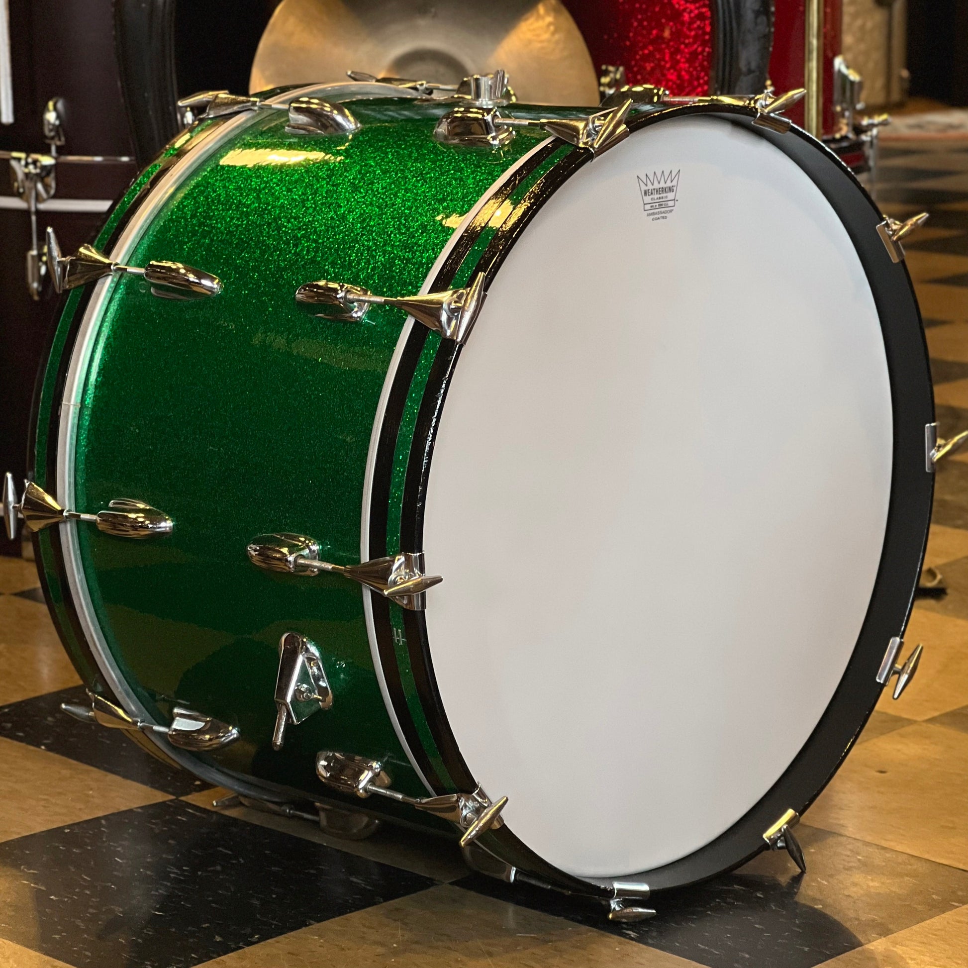- Details & Notes: An excellent, and beautifully preserved 22" Green Sparkle Slingerland Bass drum. The interiors and edges are in excellent shape and the wrap is pristine. All hardware is fully functional and present. The drum needs oversized heads, as usual for many old Slingerlands.