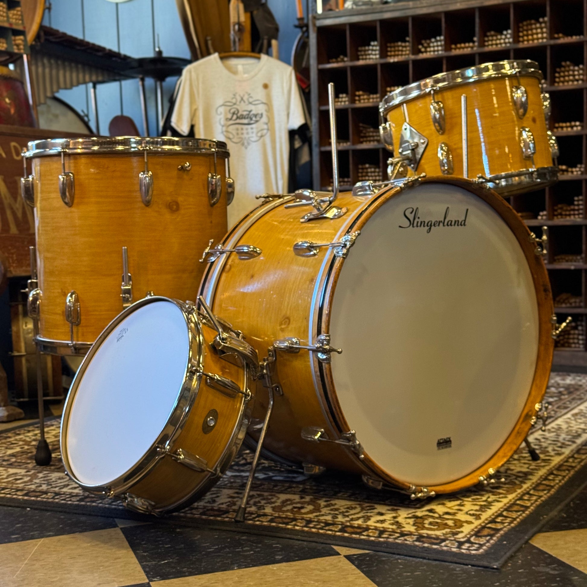 VINTAGE 1950's Slingerland 4pc Radio King Gene Krupa Outfit in Knotty Pine - 14x22, 9x13, 16x16, 5x14