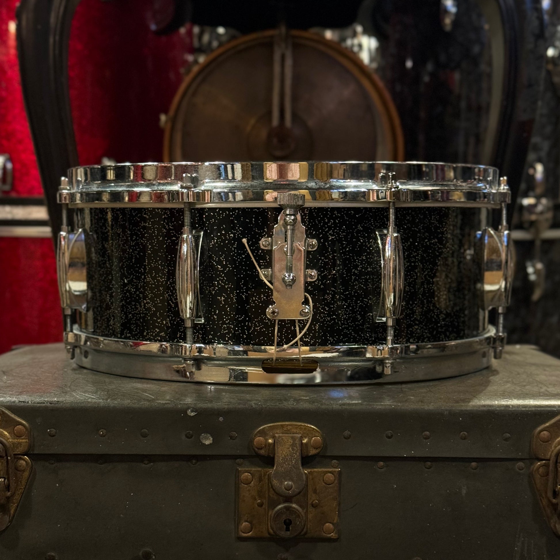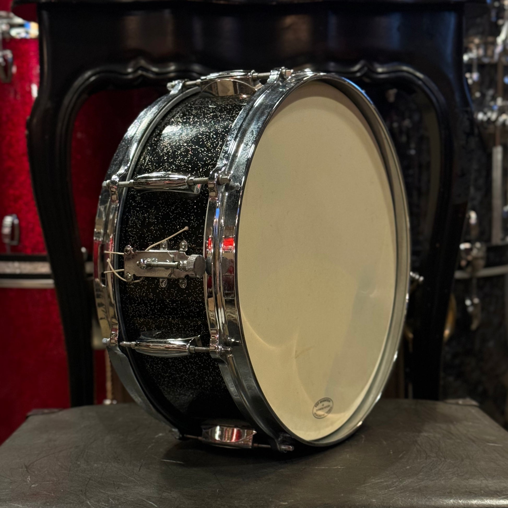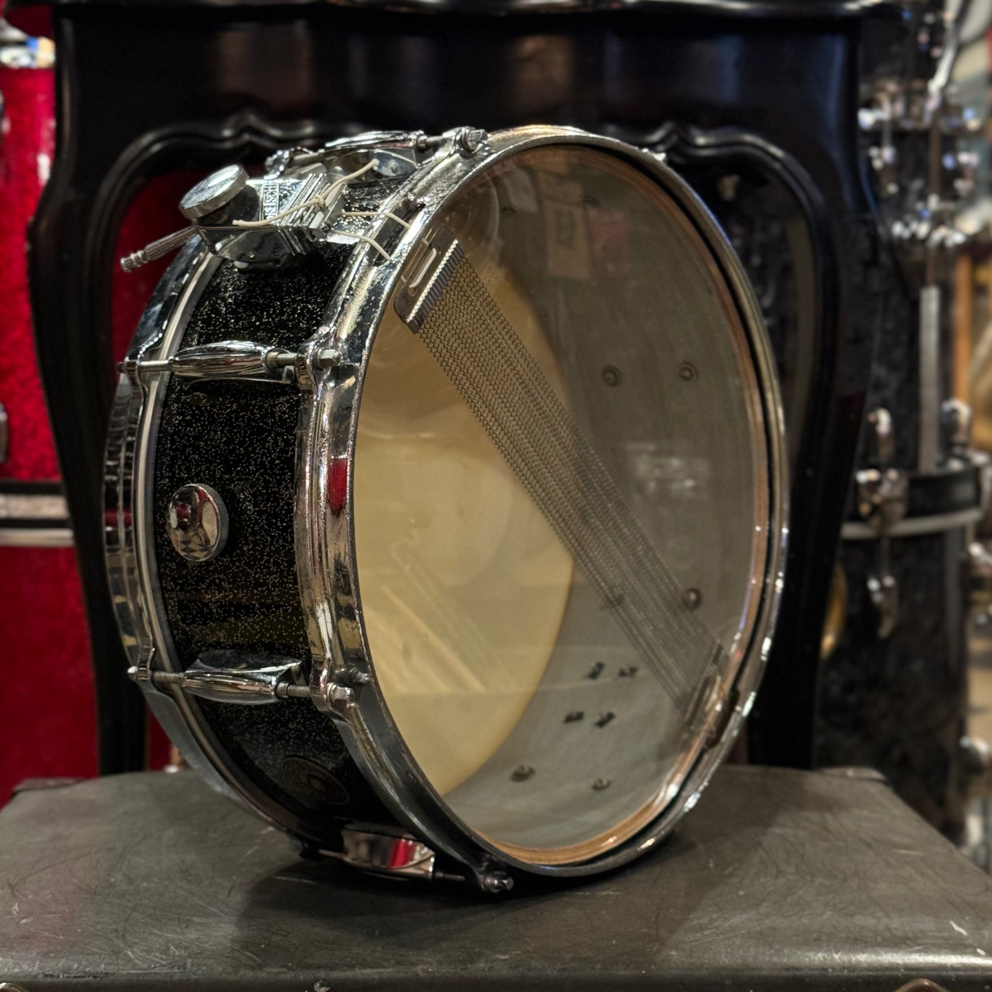 - Details & Notes: A beautiful and rare piece of Gretsch history. Anniversary Sparkle commemorated Gretsch's 75th anniversary as a company and was produced for one year only. Classic "Name Band" model with 8-lugs, Micro-Sensitive throw-off, and adjustable butt plate. 6-ply shell which is in very good condition with original silver sealer. No paper tag, as Gretsch didn't officially introduce paper tags as the norm until 62'. All original hardware, with the exception of the snare wires which are of the period Slingerland. Though the wires arn't original, it adds a bit of magic to the history side of the drum, as many NY Jazz drummers would sub out Slingerland wires for the Gretsch Responso wires on their drum. The hardware is all in very good shape, however the knob on the Micro-Sensitive throw was bent slightly at one point. The throw still works completely fine, though there is a bit of resistance. There is a school inscription etched into the resonant hoop. This is a wonderful looking and sounding drum, with a beautiful history.