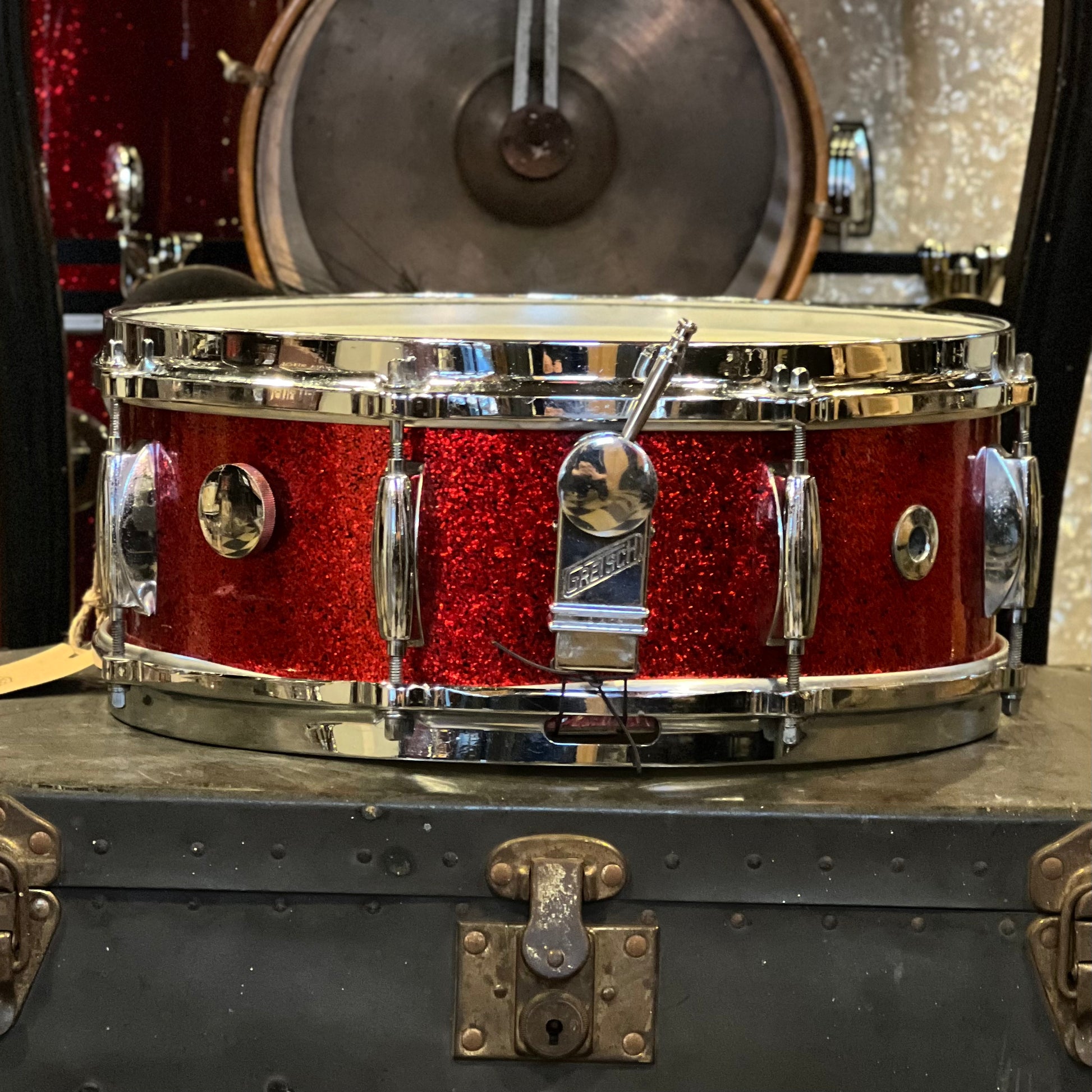 - Details & Notes: The classic Great Gretsch Sound associated with the snare drums heard on so many bebop recordings. This lovely 60's 6ply Round Badge has all the goodies. A working Micro Sensitive strainer and adjustable end plate, functional internal tone control, hefty die cast hoops, and a lovely Red Sparkle wrap that glimmers in the light. The drum is over all in great condition, though there is a slight bit of wrap lift at the seam and a few minor scratches. The Micro Sensitive is missing the bottom clasp (a very common occurrence), so the snare strings are just threaded through the bottom plates screw holes (some players even did this intentionally to ensure their snares didn't fail on a gig). The drum features vintage snappy snare wires.