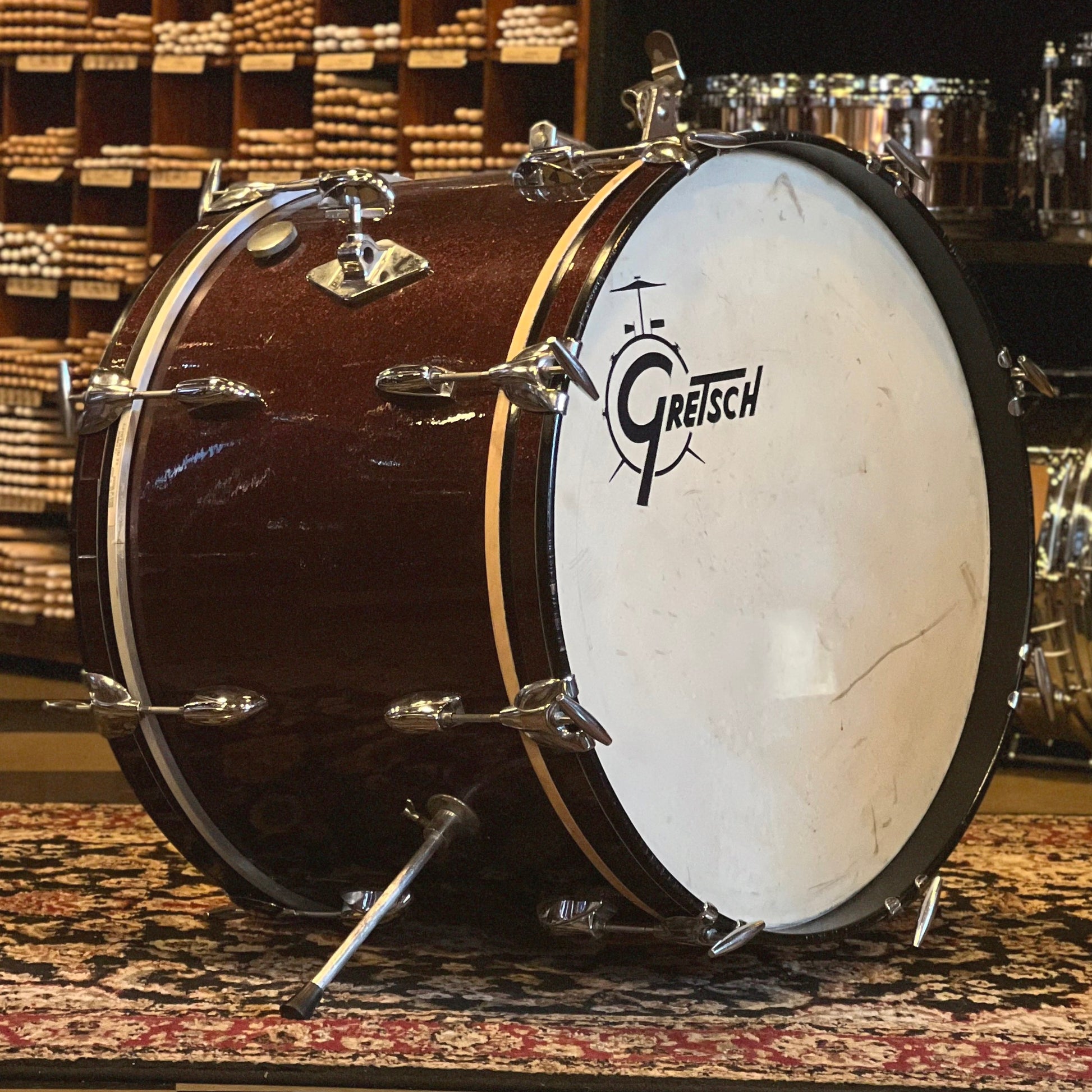 - Details & Notes: A gorgeous Gretsch "Name Band" outfit. The much beloved Gretsch "Name Band" outfit features an incredibly versatile combination of a classic 20" bass drum paired with a 13" tom and a 16" floor tom, giving plenty of room to cover ample sonic ground. All shells feature Gretsch "Silver Sealer" and tags. This set has been rewrapped in a modern version of burgundy sparkle, which does differ from the authentic 1960's Gretsch version of the wrap. This wrap leans more on the purple hue and is slightly more reflective. All hardware is original with the exception of the snare wires, which have been replaced with generic snare wires. The wrap is slightly separating on the 14" snare drum at the seam. Drum heads fit tight on these drums, as was extremely common from Gretsch drums of this era. Oversized drum heads are recommended for this kit. Logo bass drum head has been changed to a Remo Classic Fit.
