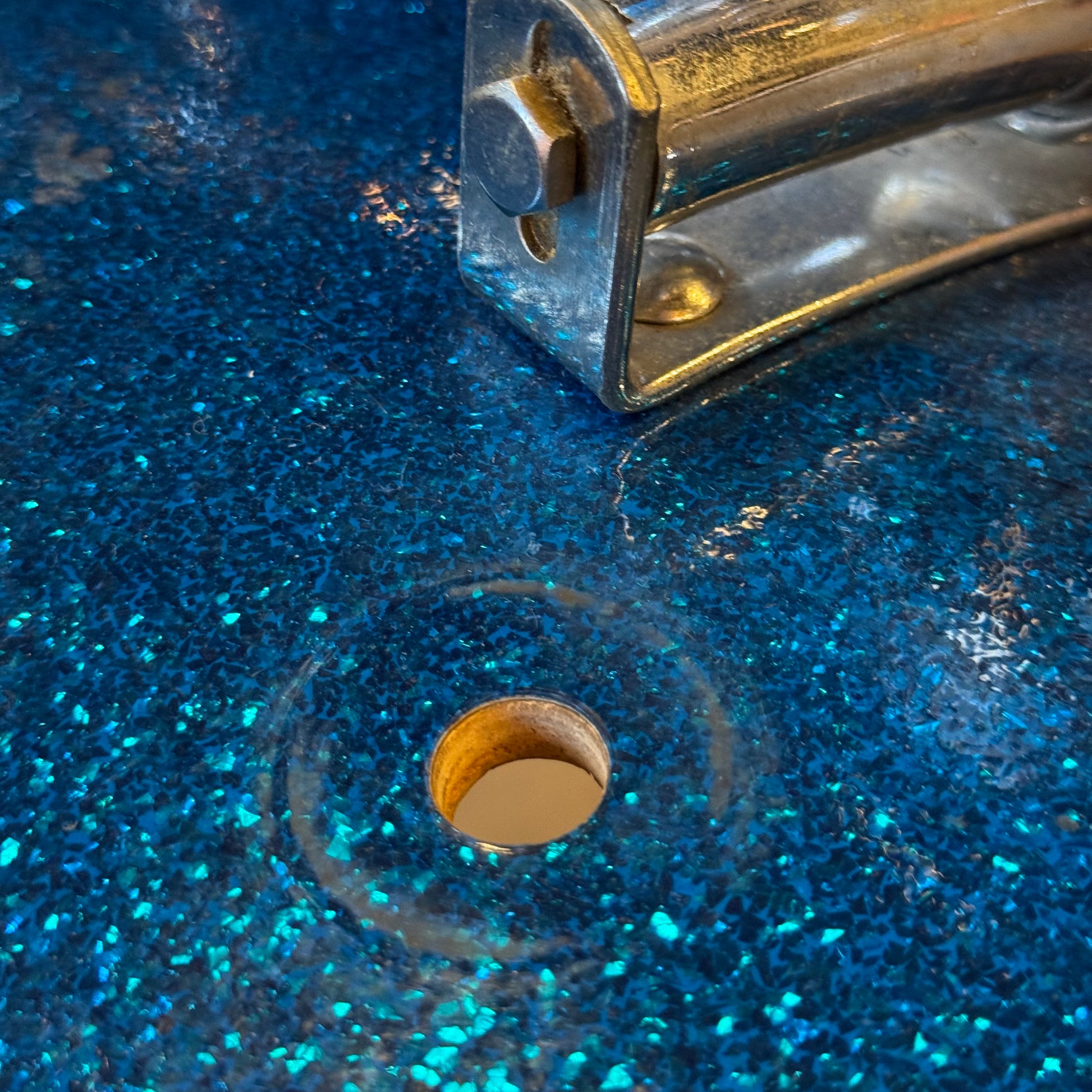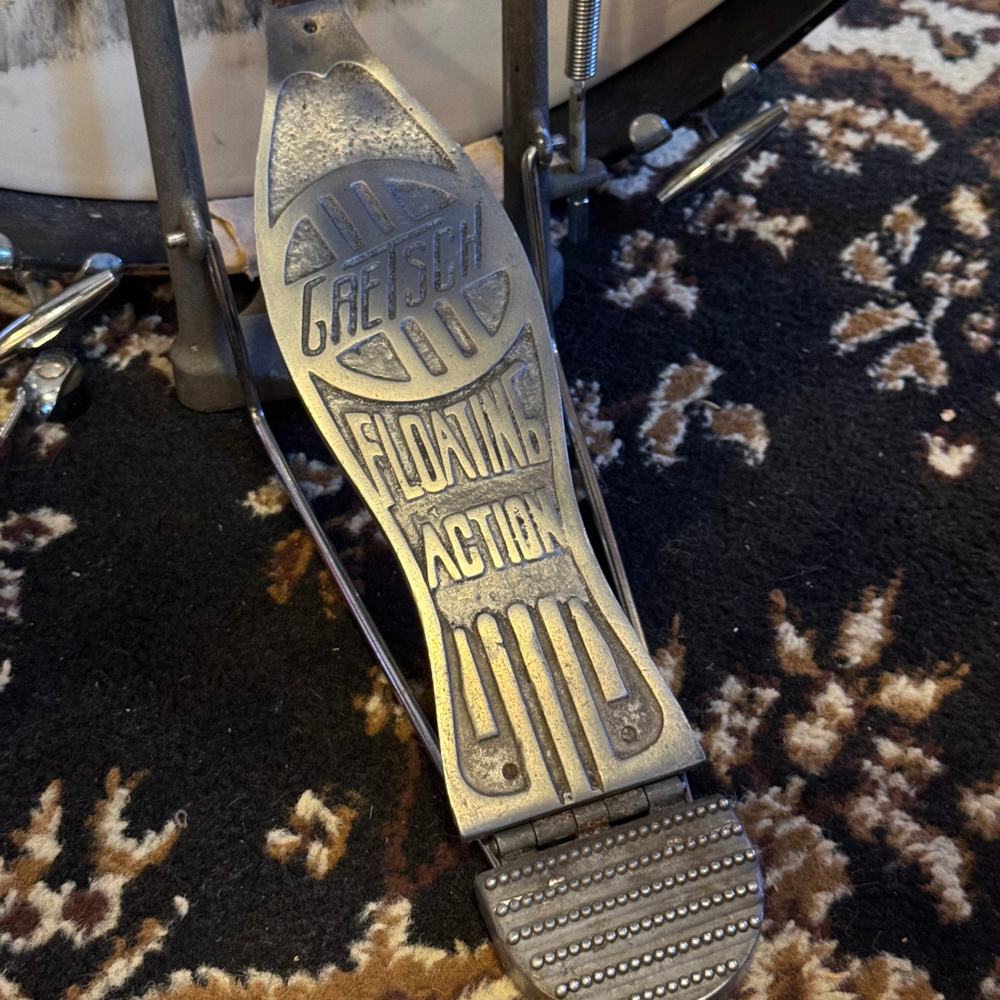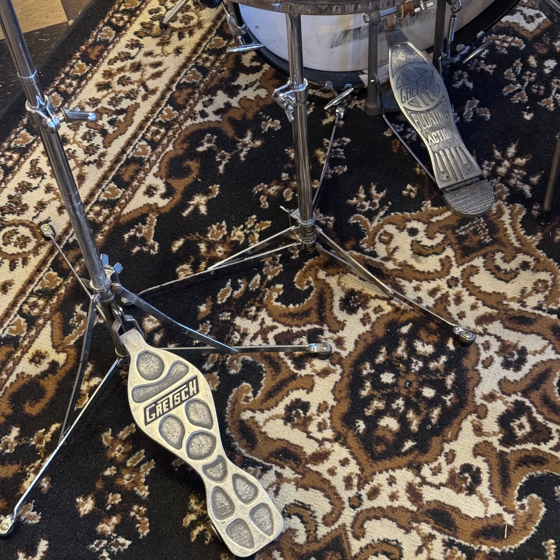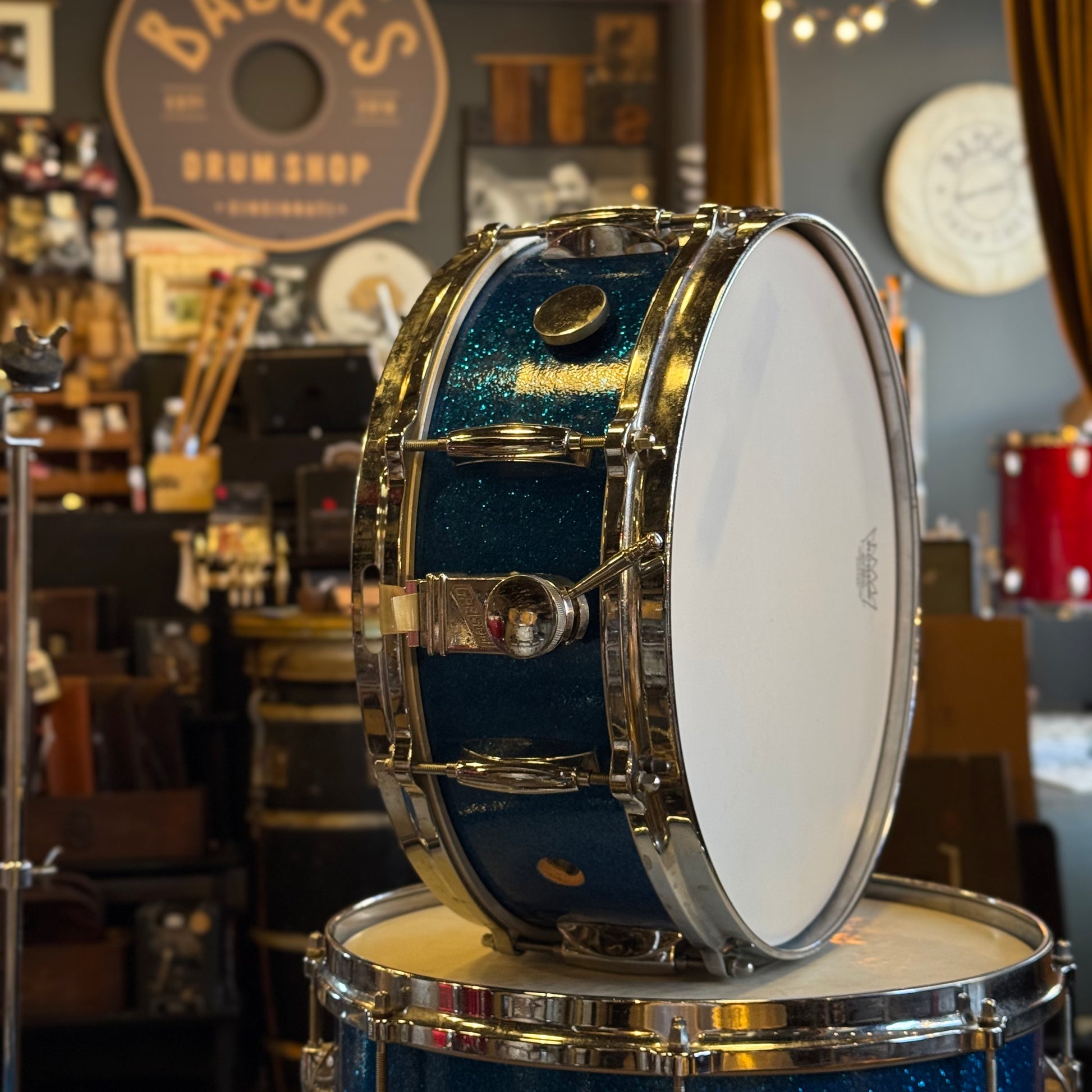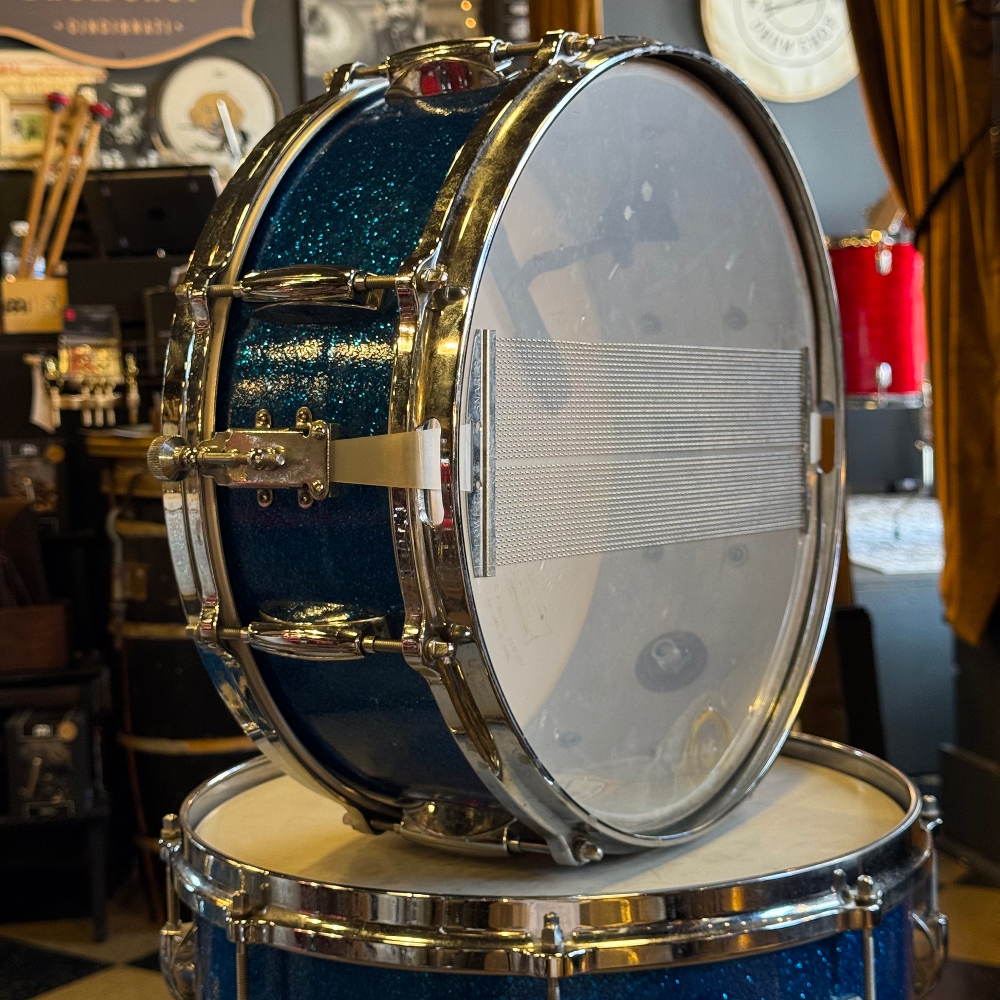 - Details & Notes: A stunning Gretsch Progressive Jazz outfit in Blue Sparkle, consisting of the classic sizes of 14x20, 8x12, 14x14 and a matching 5.5x14 snare drum. Overall excellent condition, with mostly original heads and hardware. Clean edges and interiors, with paper tags in each drum. Wrap is vibrant with no cracking or lifting of edges. All hardware is original and fully functional. The snare batter head has been replaced with a modern Remo. The grommet and badge of the bass drum are missing, a typical misfortune for Gretsch of this era. The snap in key holder of the snare drum is also missing from the drum. Original 42 Strand Gretsch snare wires are on the snare drum, and are in very good playing condition. the Micro-Sensitive strainer is in full working order. All tone controls work as should including the bass drum Pratt Muffler. The bass drum cymbal arm is sturdy and fully functional as are the included Floating Action pedal and hi-hat stand. The Walburg & Auge Gretsch snare stand works but has a loose tilter. Over all in incredible piece with ample bop attitude.