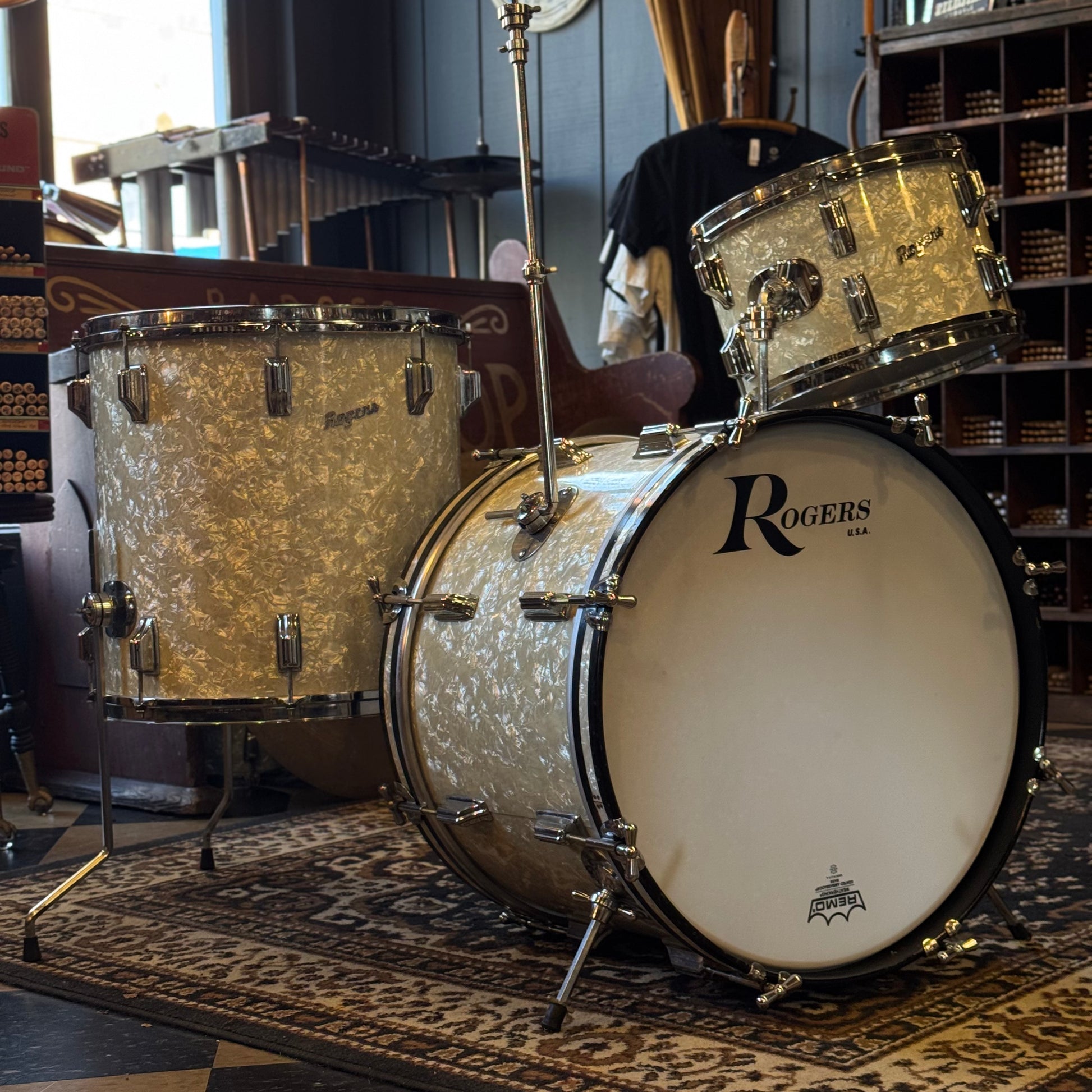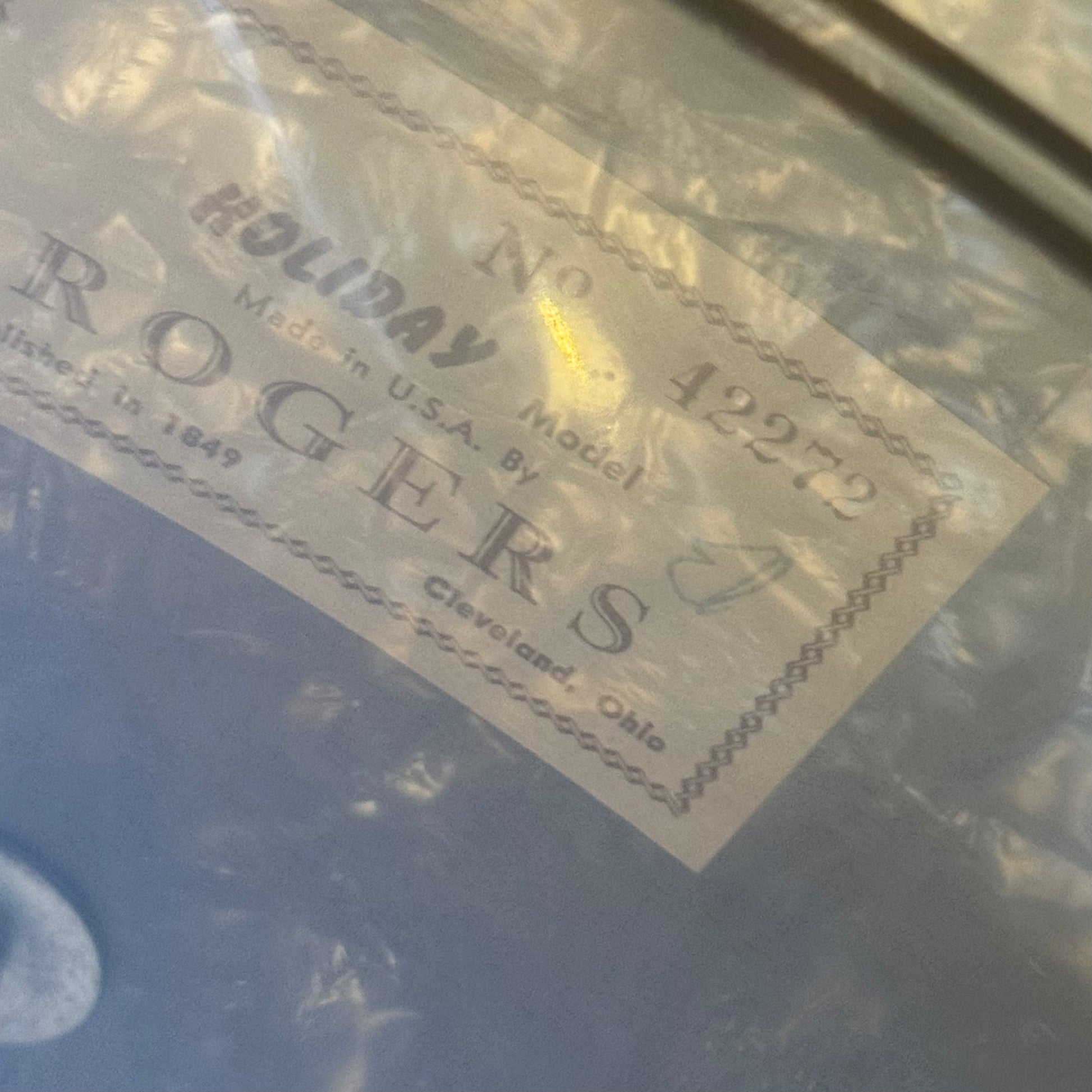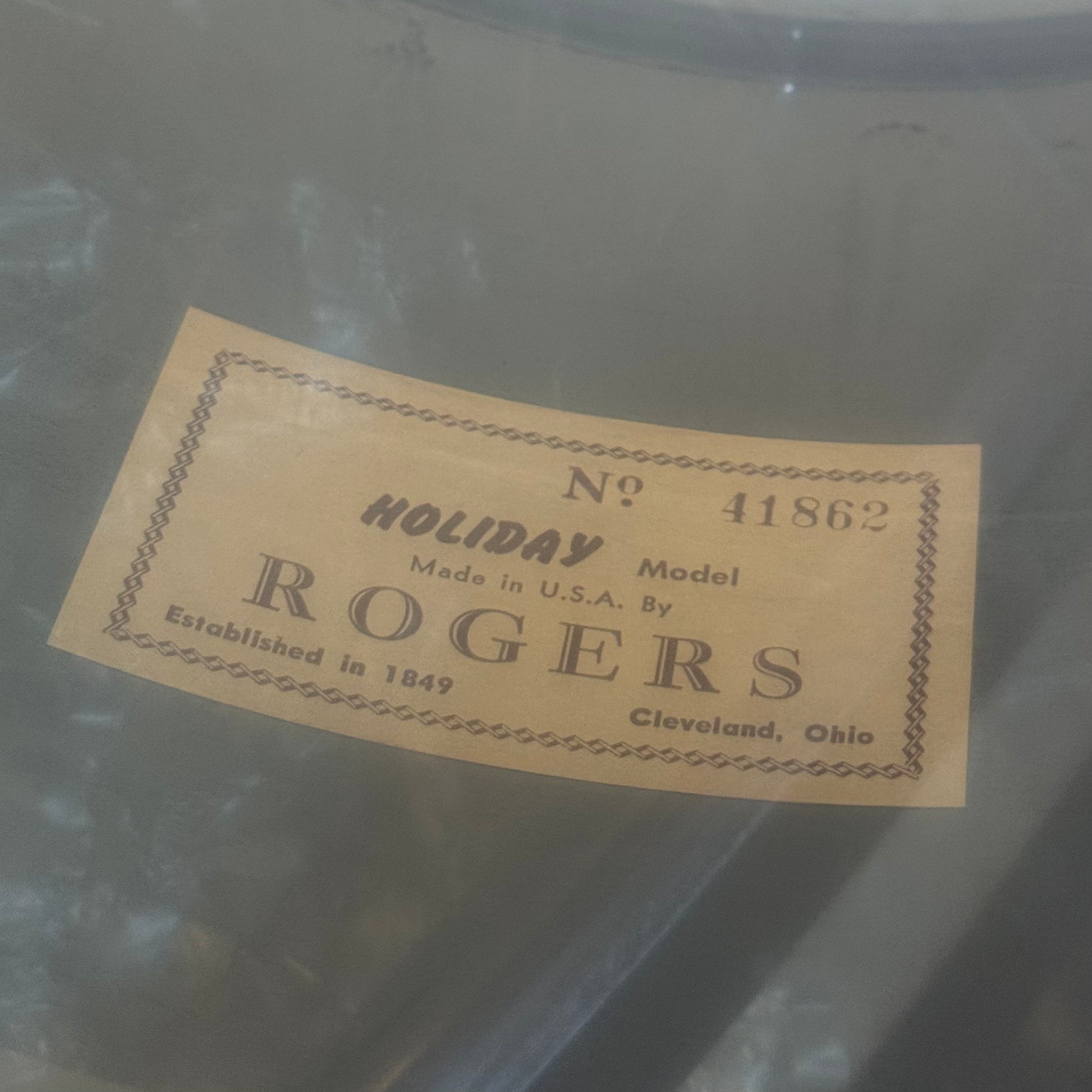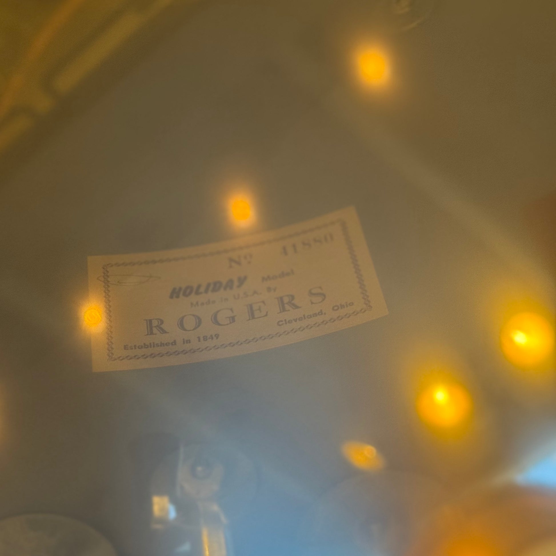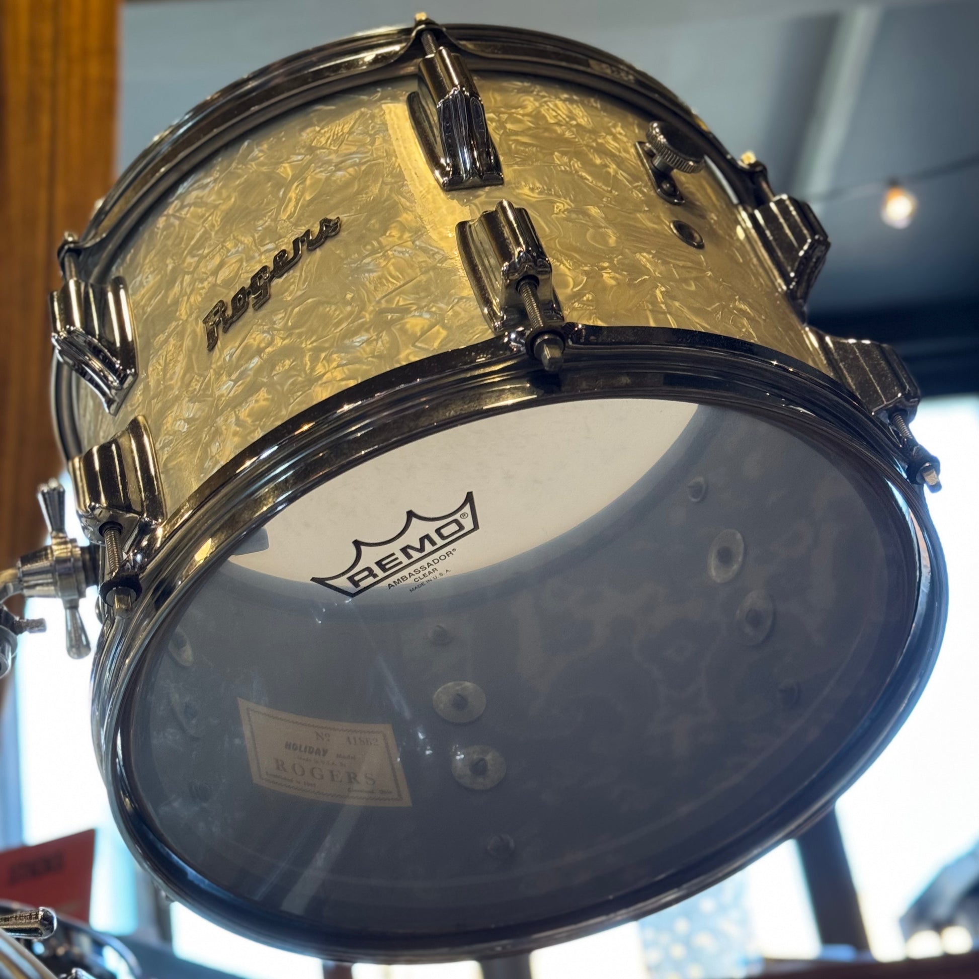- Details & Notes: Immaculate condition Cleveland Era Rogers "Holiday" Outfit. This kit has been lovingly cared for, featuring excellent edges and interiors, shiny and fully functioning chrome hardware, and a terrific tone. All Swiv-O-Matic hardware is catalog and works like a charm. Wrap is in excellent condition and vibrant. Flat grey interiors are present on each drum with an intact Rogers paper tag present. Sizes of 14x20, 8x12, and 16x16 lend this set to be highly versatile in any style of music, as it can comfortably tune both high and low and be at home.
