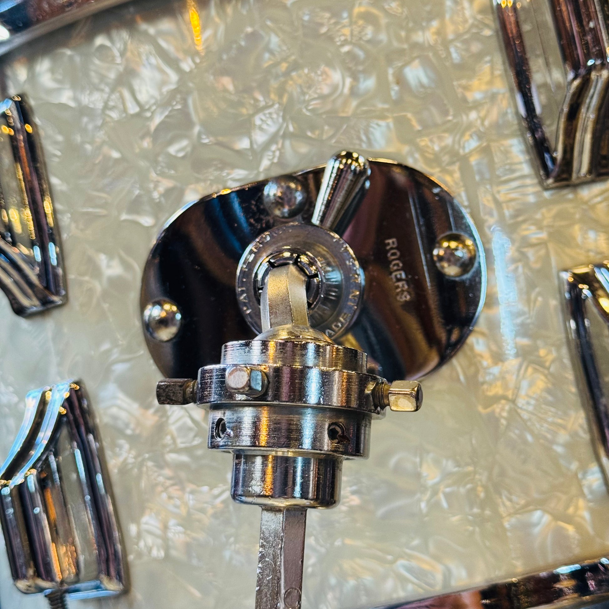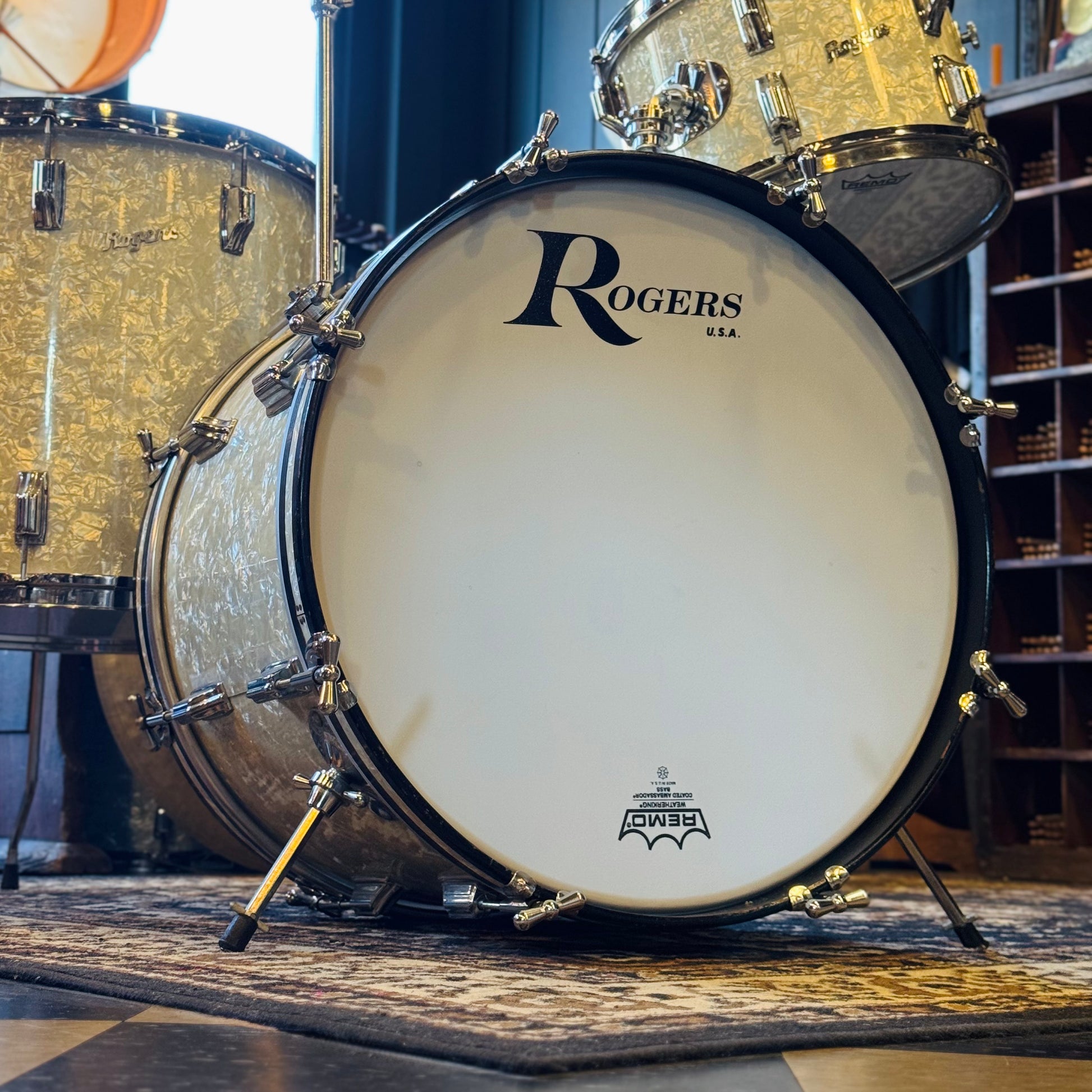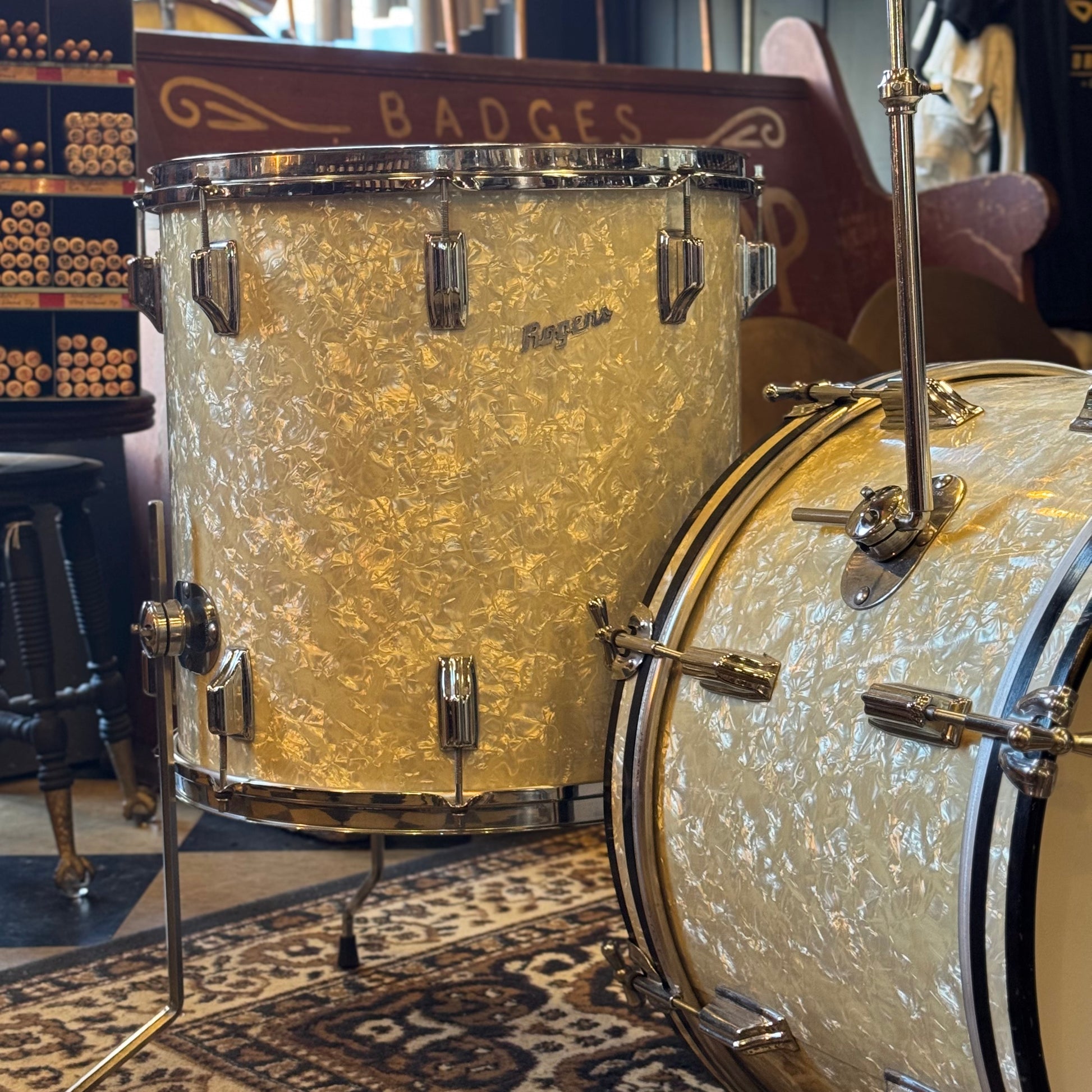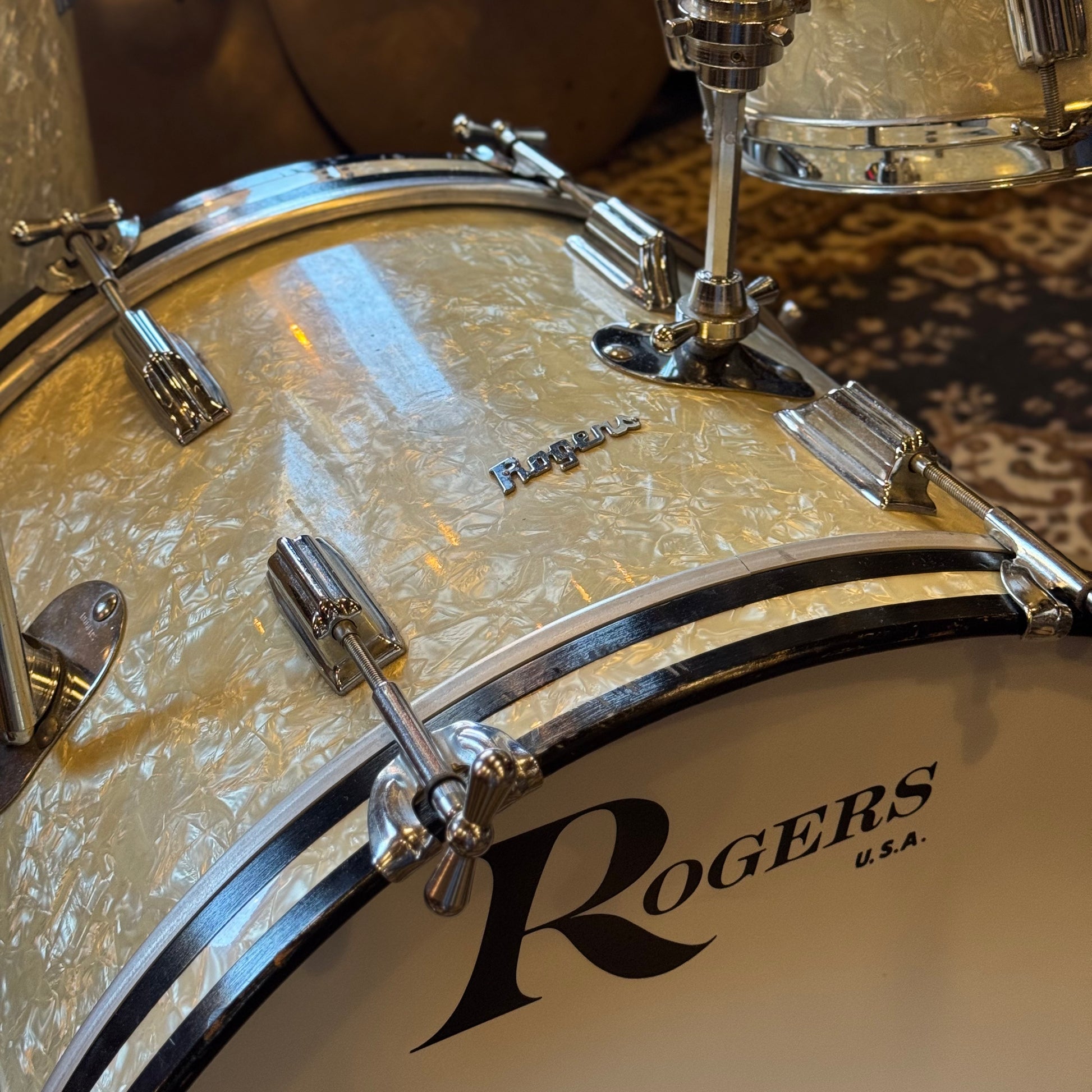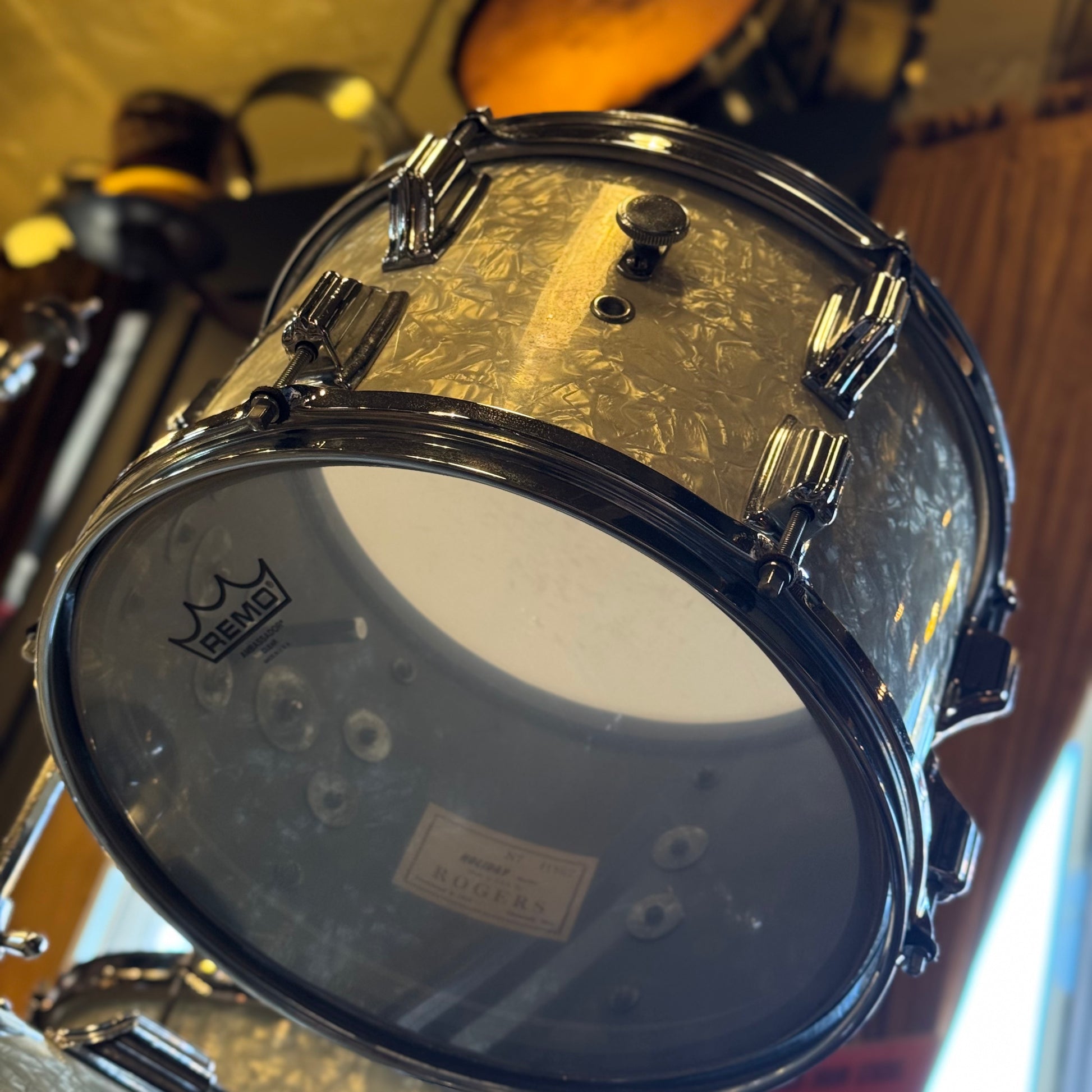 - Details & Notes: Immaculate condition Cleveland Era Rogers "Holiday" Outfit. This kit has been lovingly cared for, featuring excellent edges and interiors, shiny and fully functioning chrome hardware, and a terrific tone. All Swiv-O-Matic hardware is catalog and works like a charm. Wrap is in excellent condition and vibrant. Flat grey interiors are present on each drum with an intact Rogers paper tag present. Sizes of 14x20, 8x12, and 16x16 lend this set to be highly versatile in any style of music, as it can comfortably tune both high and low and be at home.