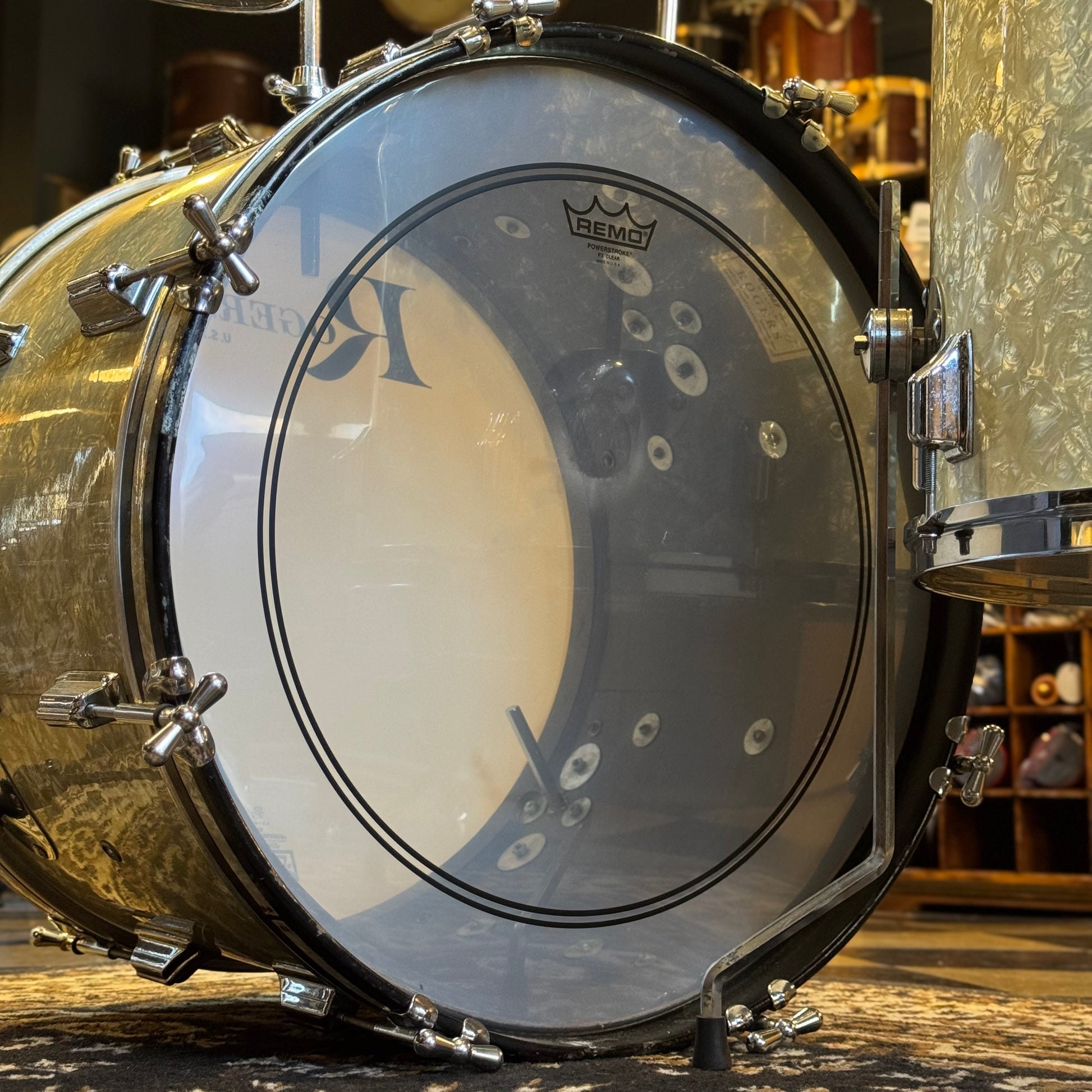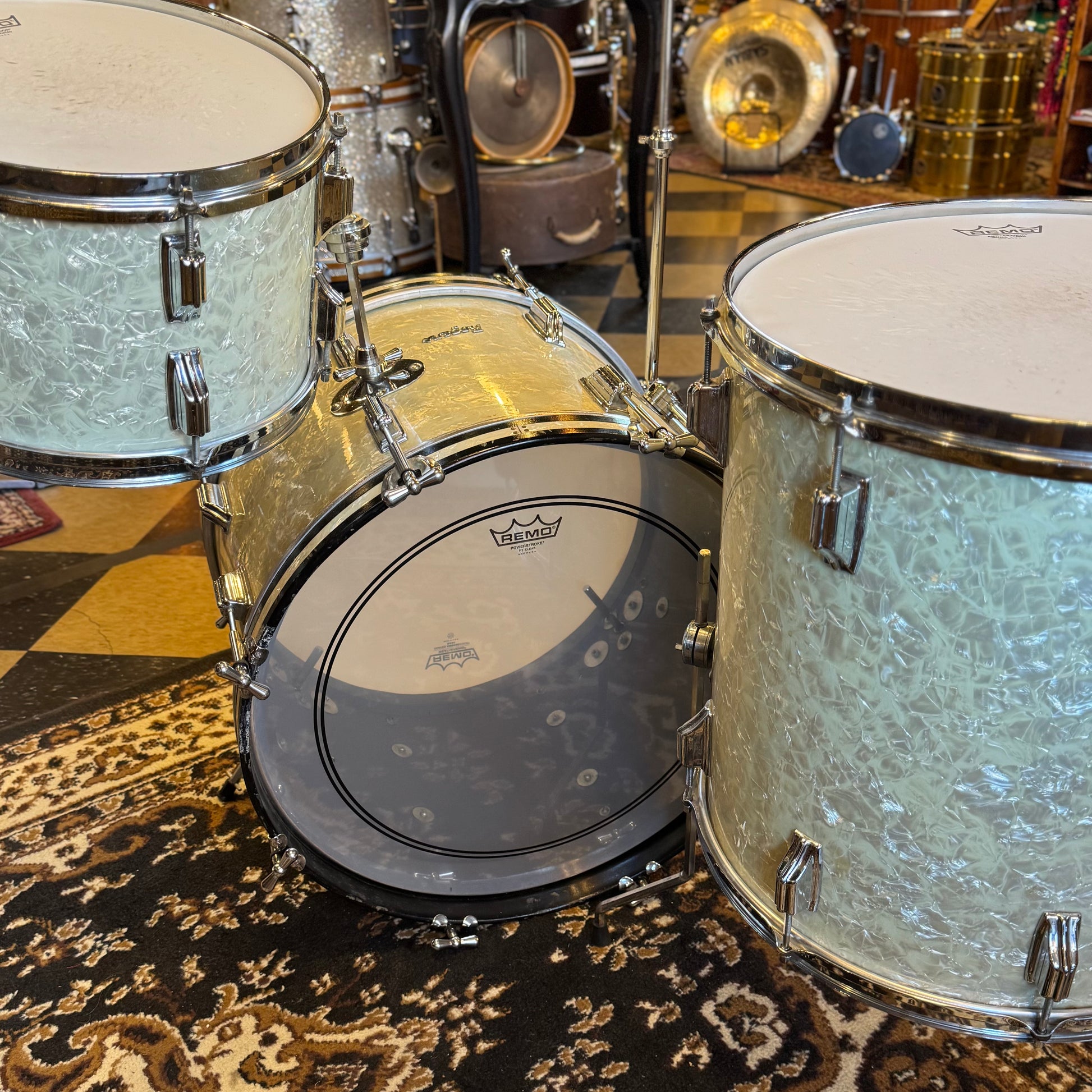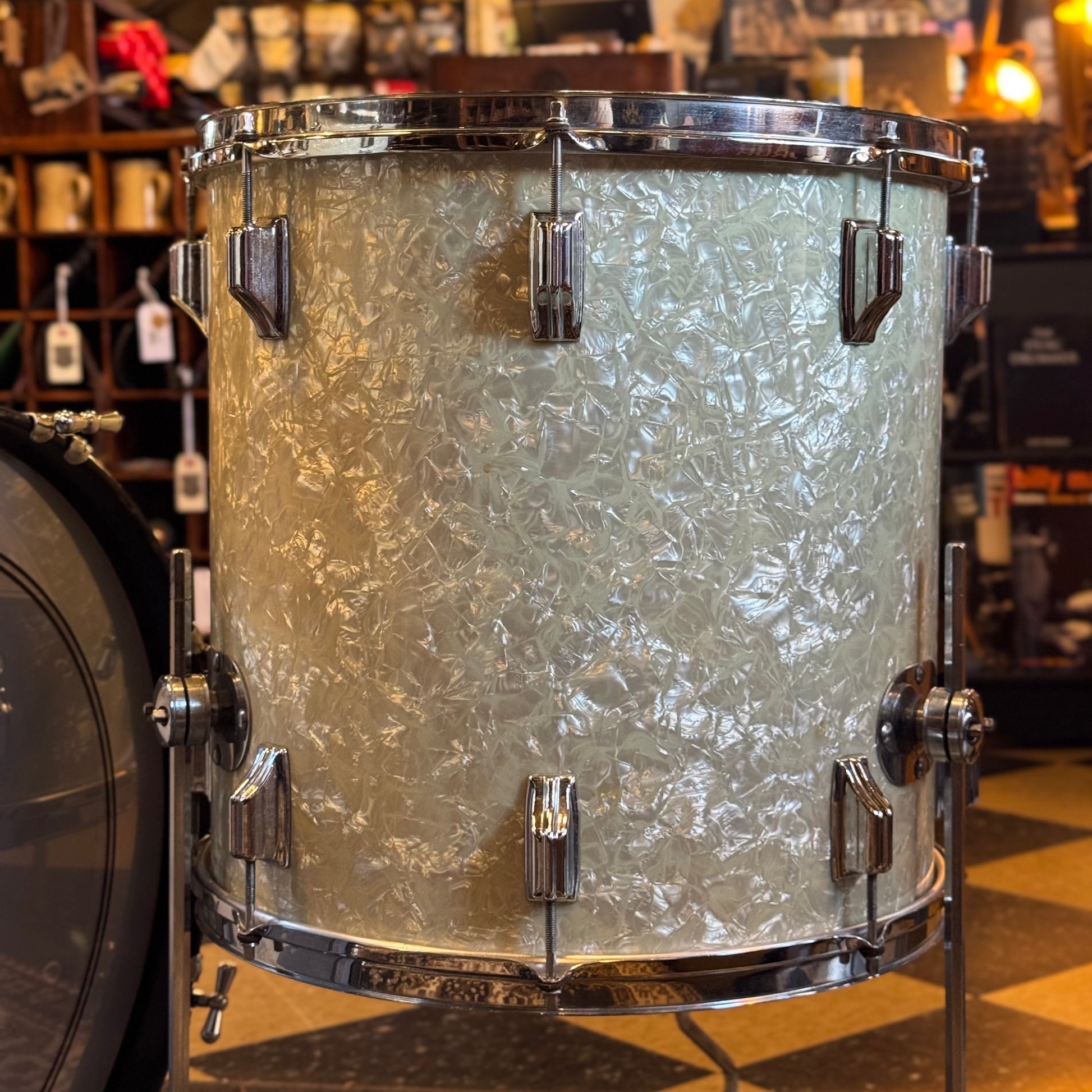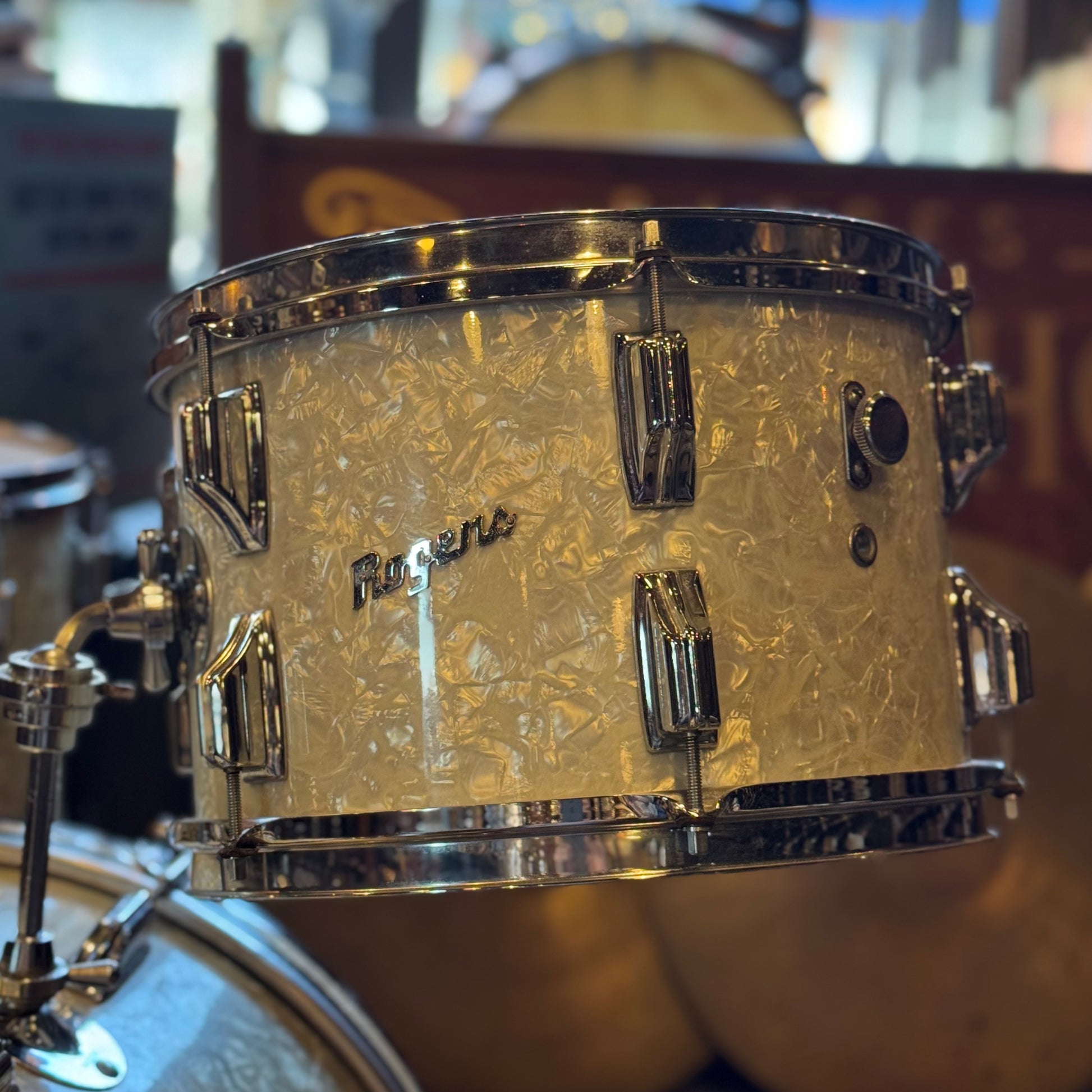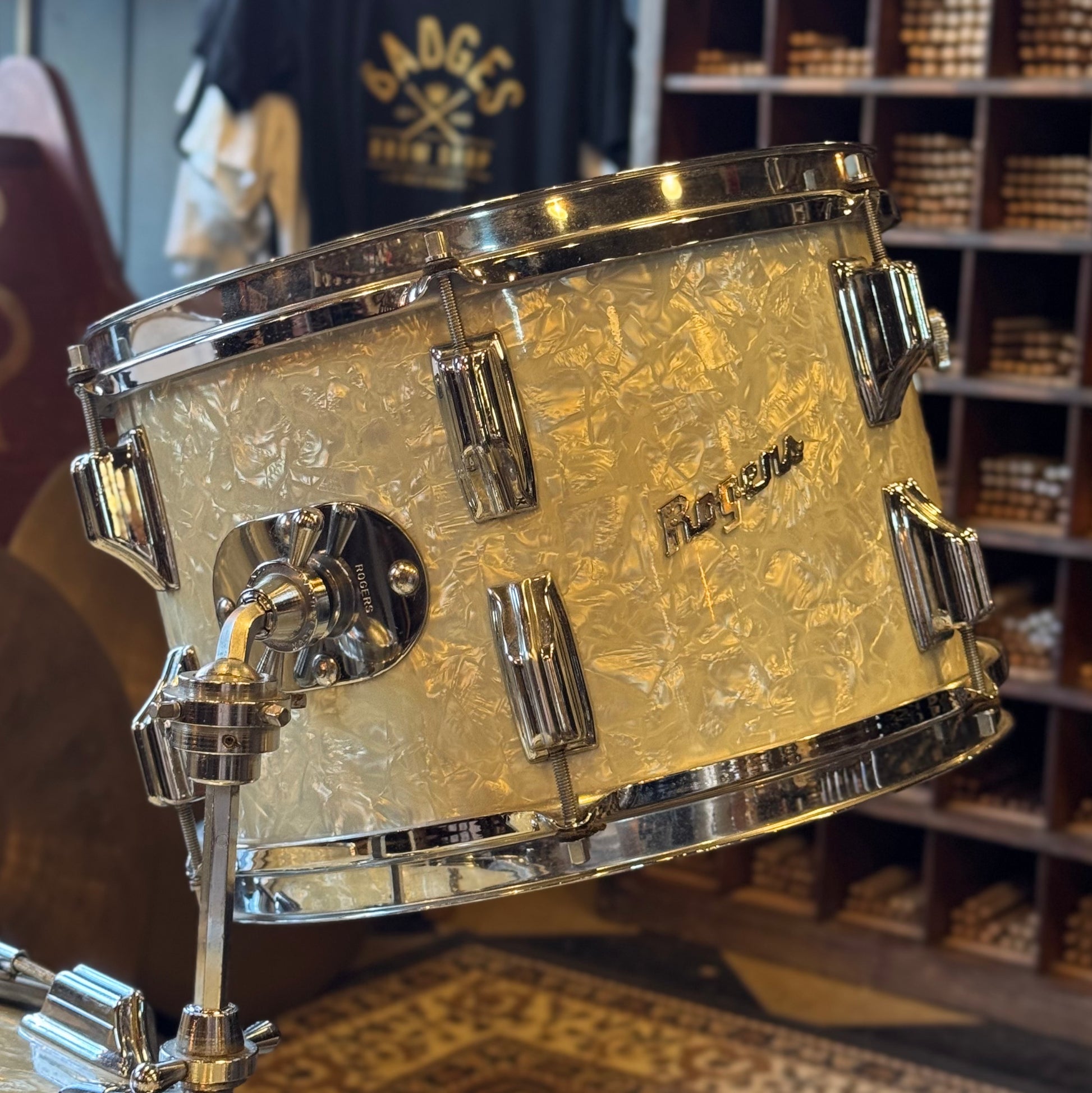 - Details & Notes: Immaculate condition Cleveland Era Rogers "Holiday" Outfit. This kit has been lovingly cared for, featuring excellent edges and interiors, shiny and fully functioning chrome hardware, and a terrific tone. All Swiv-O-Matic hardware is catalog and works like a charm. Wrap is in excellent condition and vibrant. Flat grey interiors are present on each drum with an intact Rogers paper tag present. Sizes of 14x20, 8x12, and 16x16 lend this set to be highly versatile in any style of music, as it can comfortably tune both high and low and be at home.