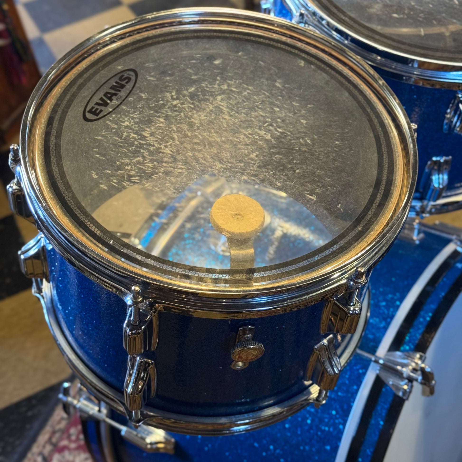 - Details & Notes: Rogers four piece in Blue Sparkle. Very clean with some minor acceptable wear. All drums are Fullerton era except for the 16" which is a Cleveland era drum. Hardware is solid and in good functional order. Era appropriate Fusion sizes of 14x20, 8x12, 9x13, and a 16x16 floor tom. The wrap is in very good, vibrant condition, with some very faint spider web cracking in the floor tom wrap that is very hard to notice unless being looked for. All tone controls are fully functional.