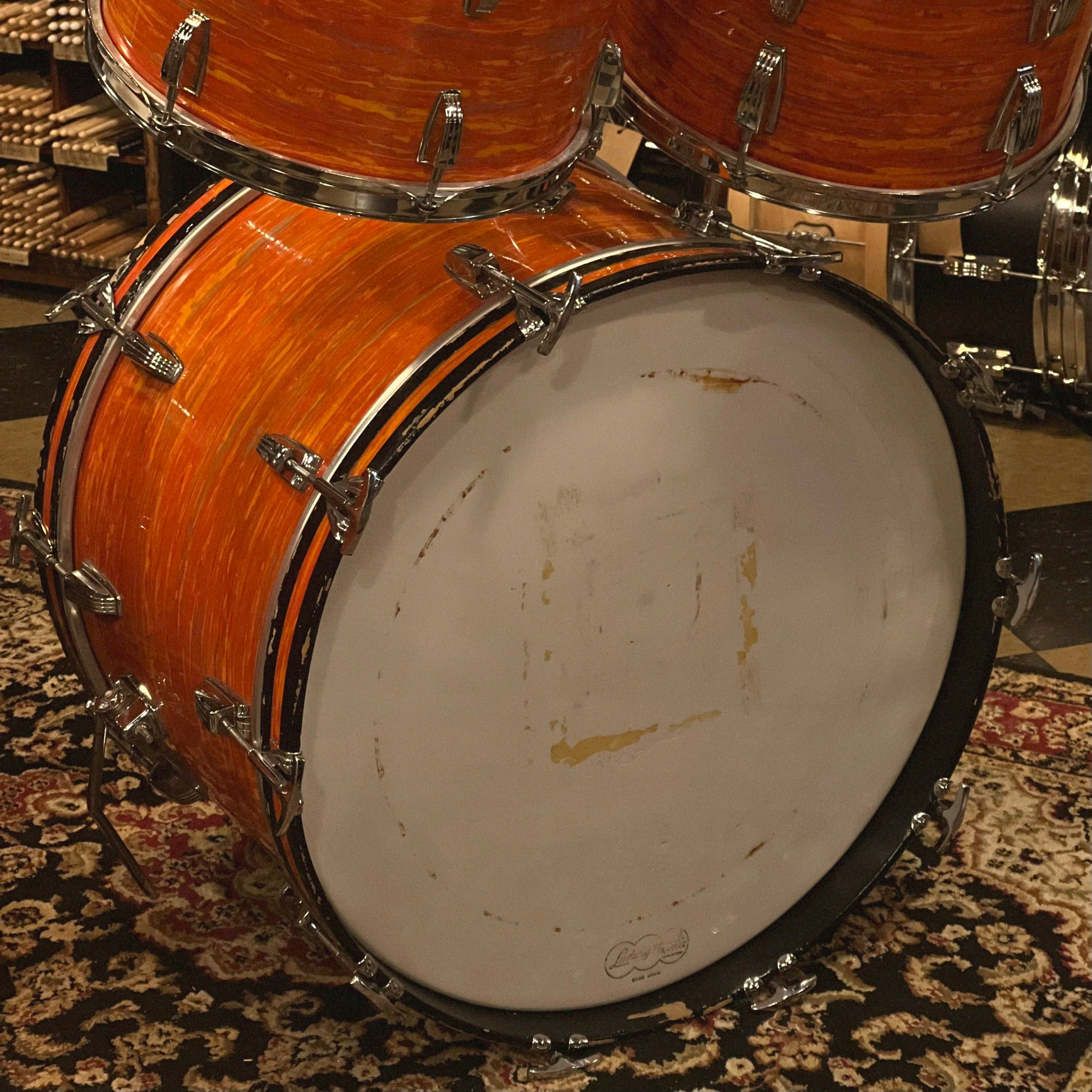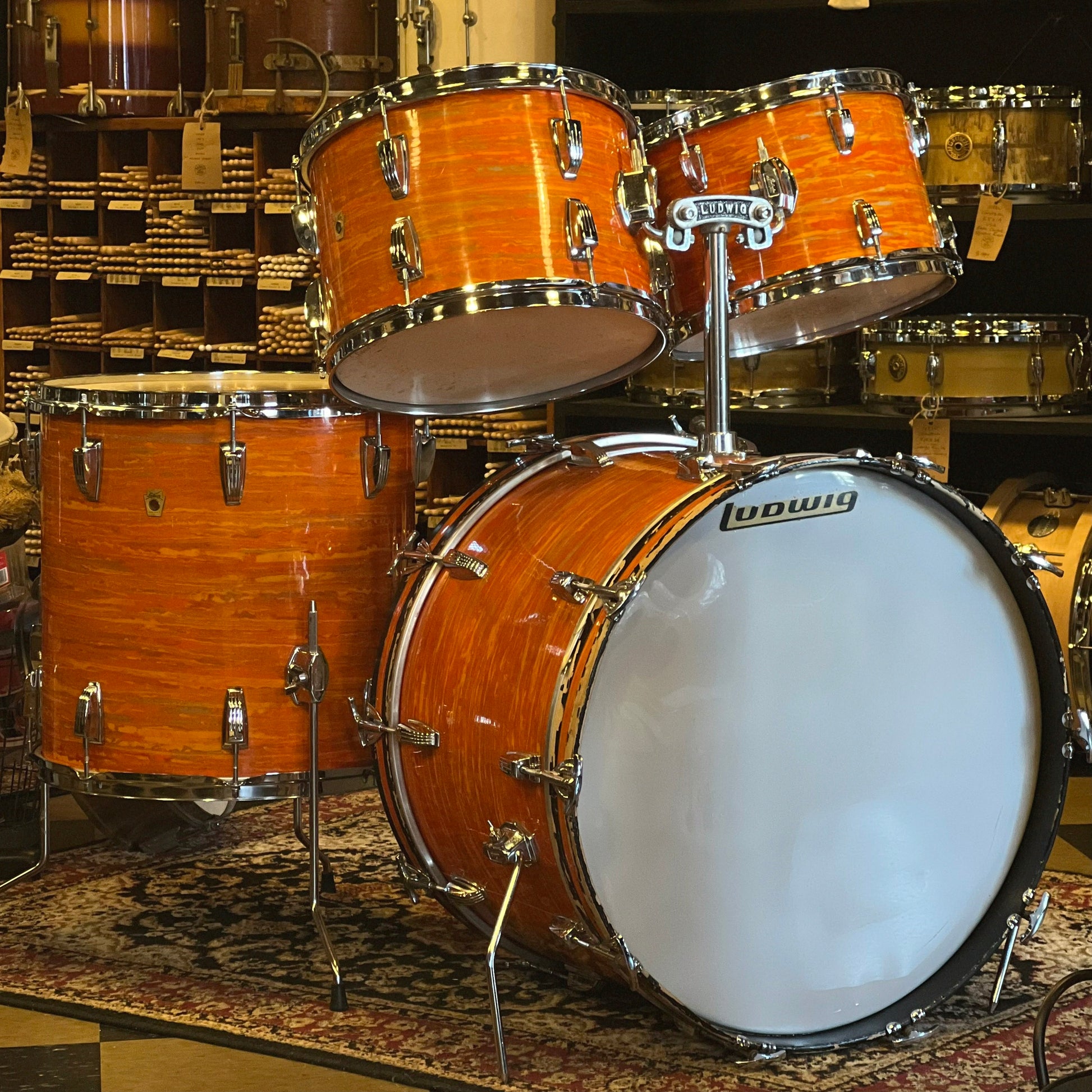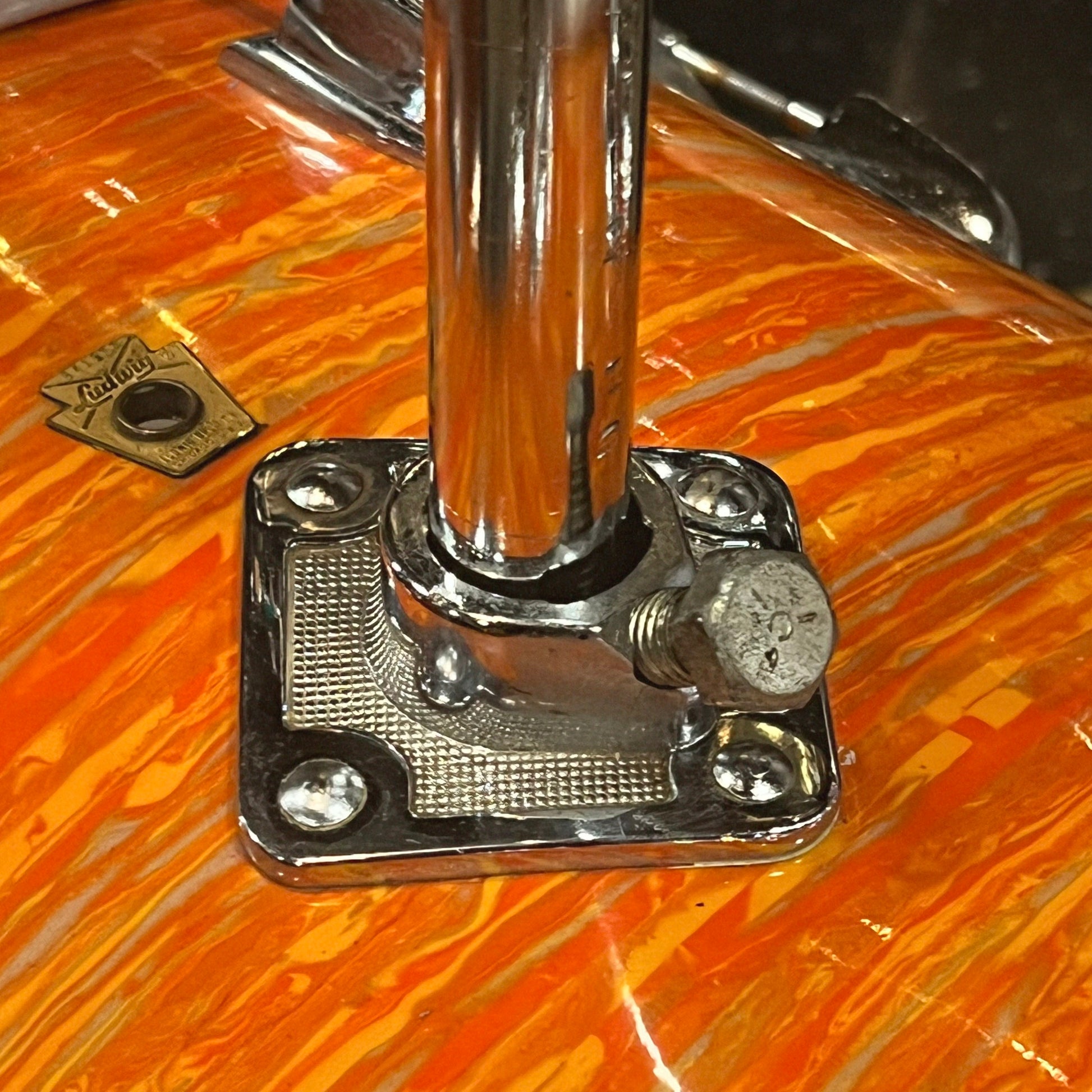 - Details & Notes: An absolutely lovely Ludwig Hollywood outfit in a very even, bright Mod Orange. The drumset is almost all original, with the exception of the bass drum tom mount plate hex screw used to secure the bass drum tom post. Heads are original, though one batter head has a small tear. The drums tune and sound great, with clean edges and interiors. Being a 68' set of drums, these drums all feature clear interiors and maple shells. All hardware is fully functional on this classic beauty.