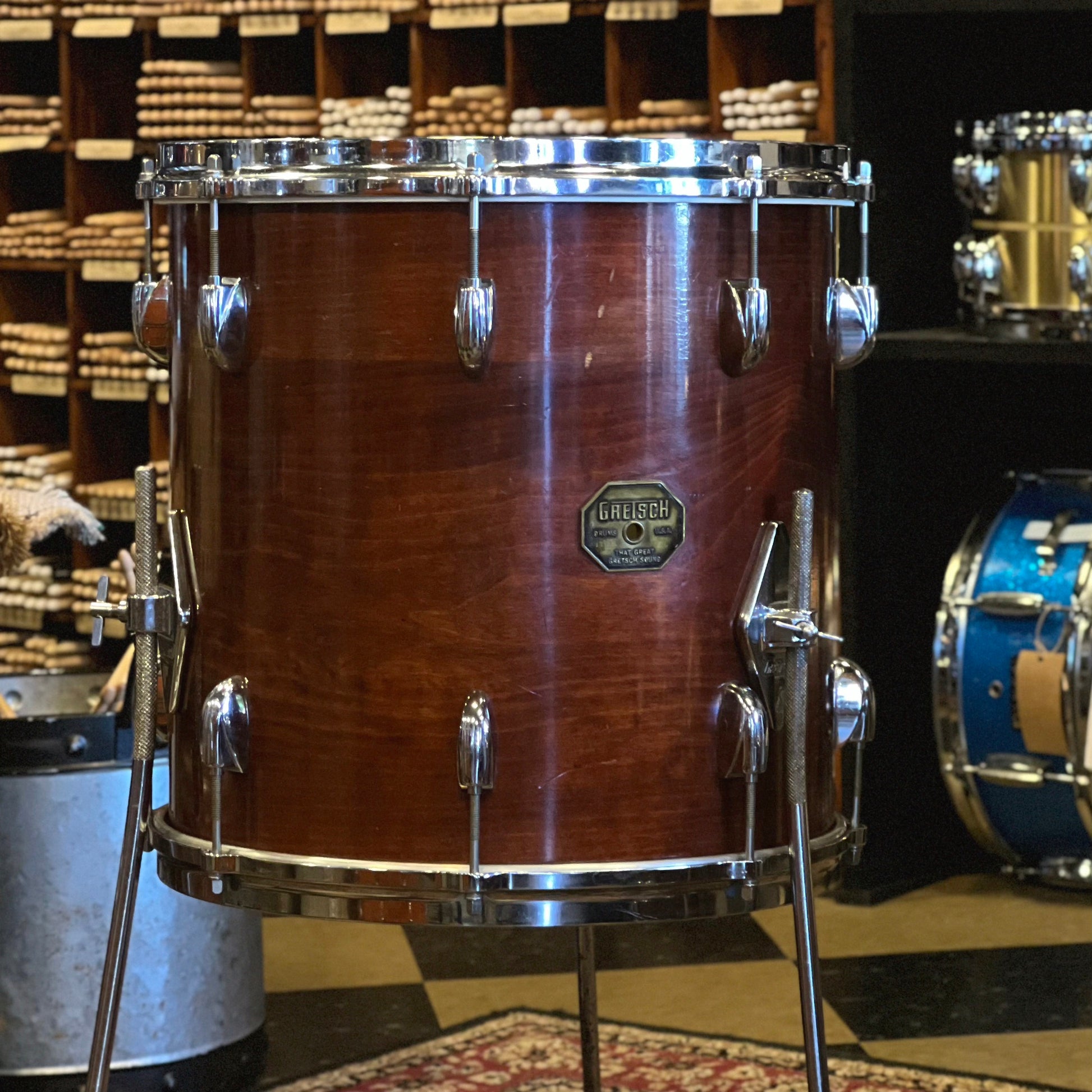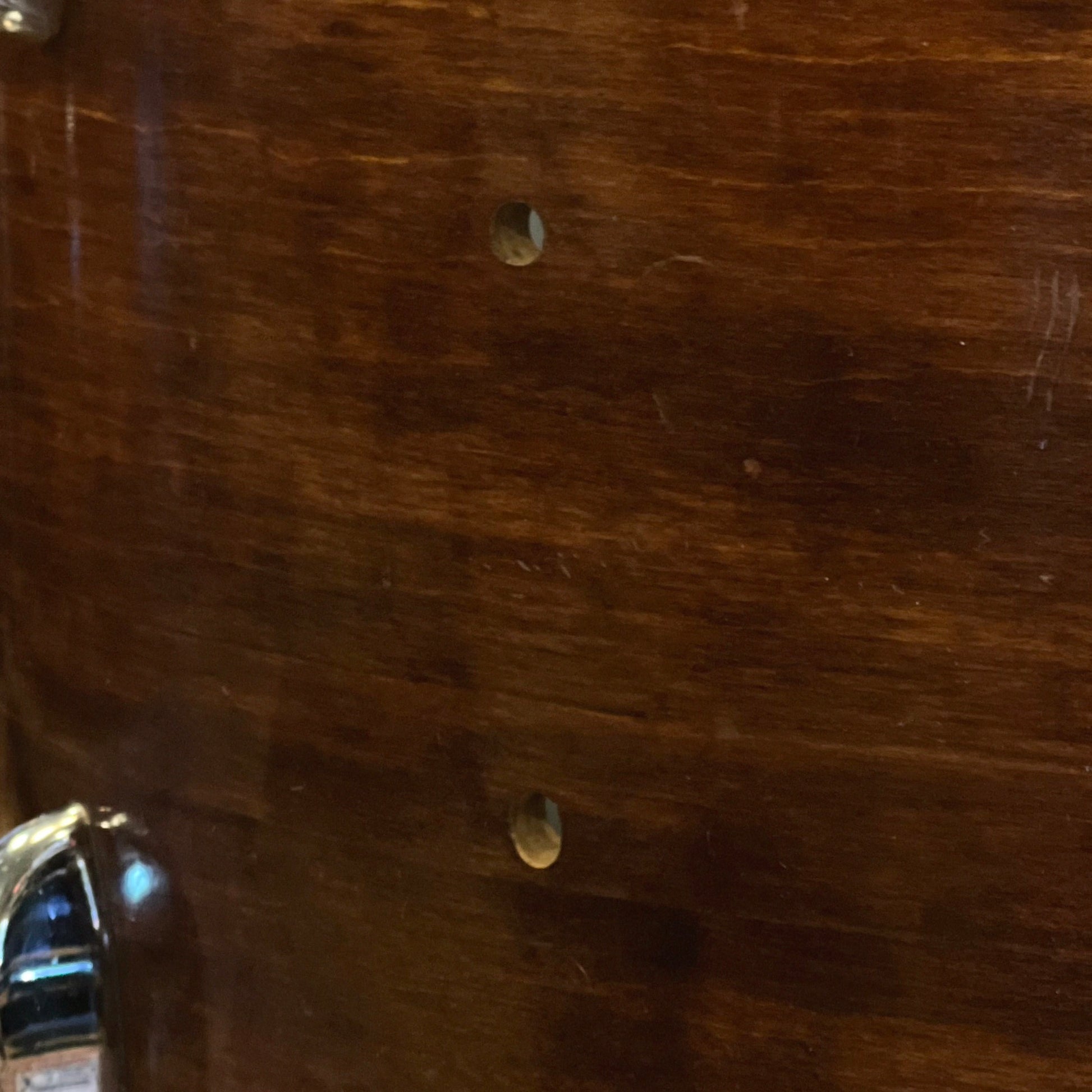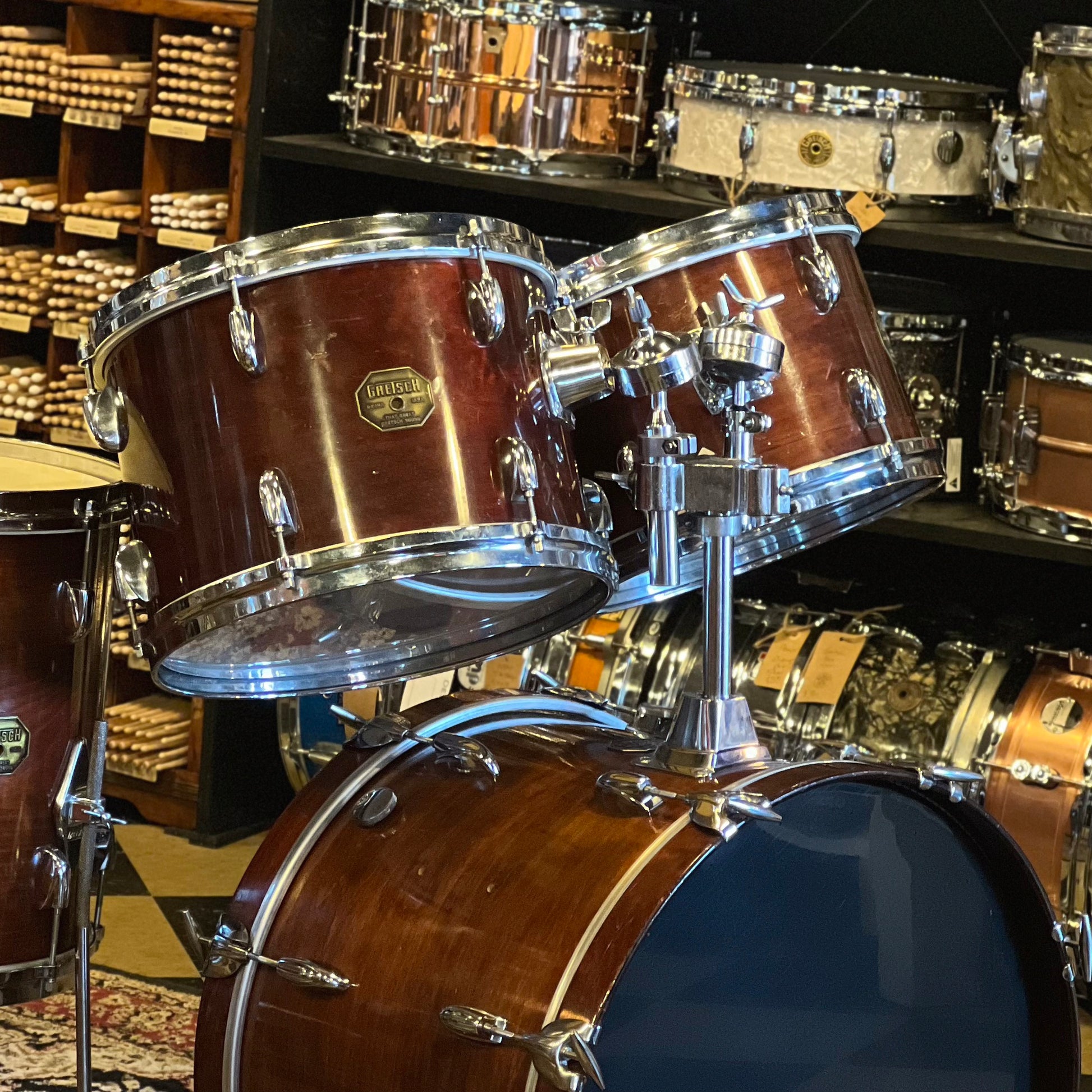 - Details & Notes: A beautiful Stop Sign Badge Gretsch with plenty of playtime and love soaked into the DNA of these rich, warm, drums. Used for years at the Cincinnati Symphony Orchestra as the "Pops" drumset. This kit was born as a 20/12/14 with a rail consollete, and the matching 13" was added on later in the year or the next year based on the badge and serial number. The rail mount has been abandoned and removed as well as the bass drum diamond plate cymbal bracket, and the 12" toms diamond plate mounting bracket. A Yamaha YESS double tom mount was added in place, leaving a few extra holes in the drums. None are present in the 13" however as it was ordered virgin. The 13" is ever so slightly darker in color, but is hardly noticeable when the kit is set up together. The drums tune perfectly and perform well with both low and high tunings. All mufflers are present on the drums. The floor tom legs look to have been professionally angled at a machinist shop to prevent the notorious "rattle" of the legs hitting the bottom hoop, a common occurrence on 60's and 70's Gretsch drums.